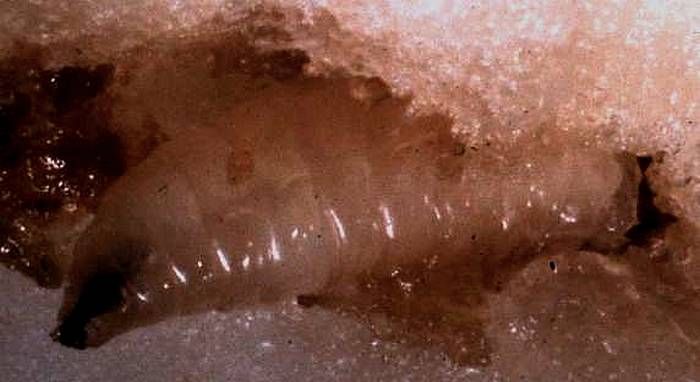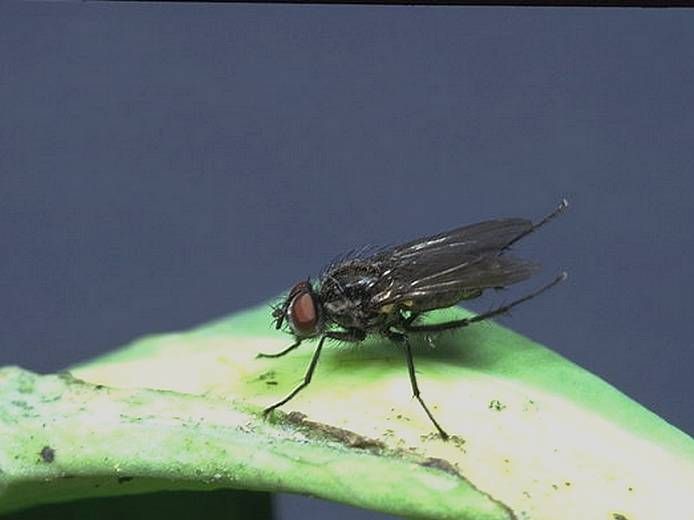 L’adulte (figure 1), gris, mesure 6 à 8 mm. L’abdomen de la femelle est gris clair. Les pattes arrière du mâle présentent une rangée de soies (poils) sur leur partie inférieure, observables à la loupe. Les larves sont des asticots qui mesurent 9 à 10 mm de long (figure 2).