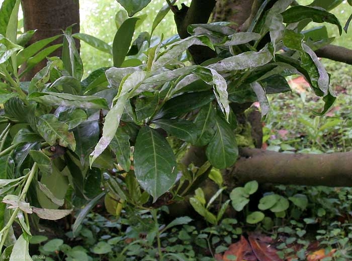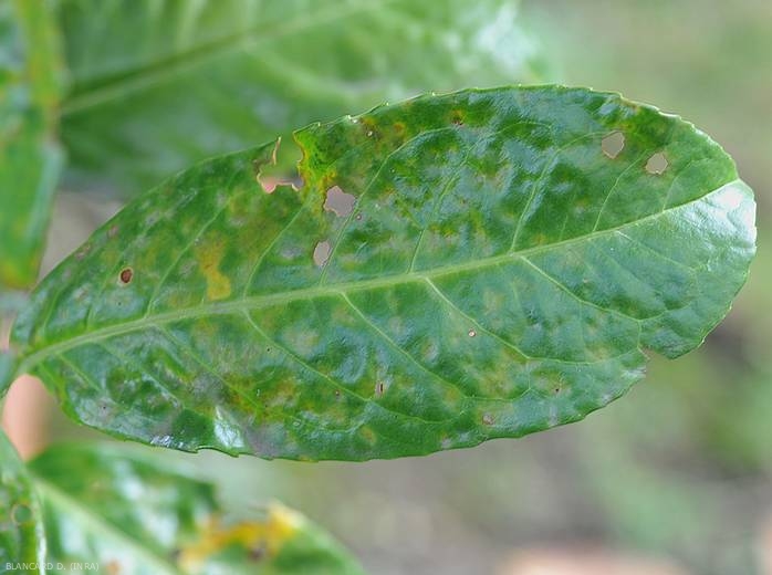 Les tissus attaqués se nécrosent et disparaissent, laissant aux feuilles un aspect criblé caractéristique (figures 3 et 4).