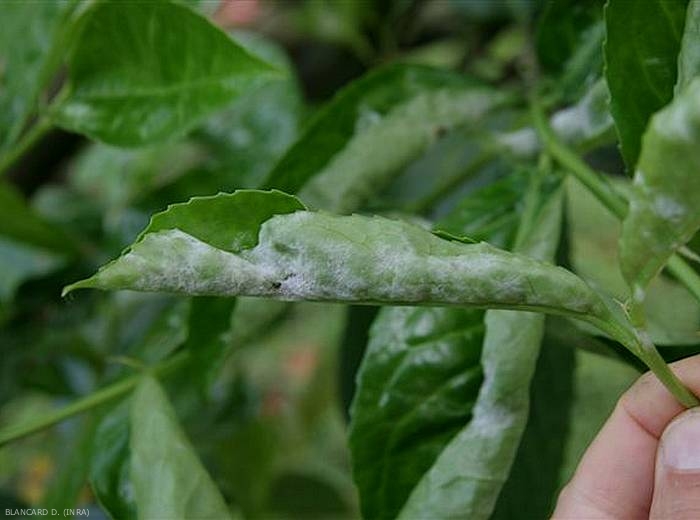 Les pousses attaquées se recouvrent d’un feutrage d’aspect farineux (figures 1 et 2). Les feuilles atteintes sont déformées (figures 1 et 2) ou bien, lors d’attaques plus importantes, se développent partiellement, les pétioles restant courts et arqués, le limbe étant crispé avec un revêtement mycélien sur les deux faces.