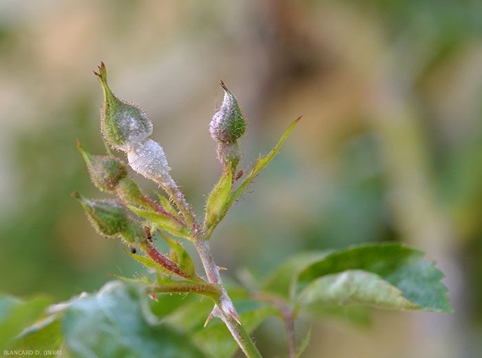 Le champignon apprécie les tissus jeunes et produit un feutrage blanc sur les différents organes aériens du rosier. Les jeunes pousses et les feuilles (figures 1 et 2) se couvrent de taches poudreuses blanchâtres, ce qui peut entrainer une déformation importante du limbe (figures 3 et 4). L'ôïdium provoque également le dessèchement des boutons floraux envahis (figure 5).