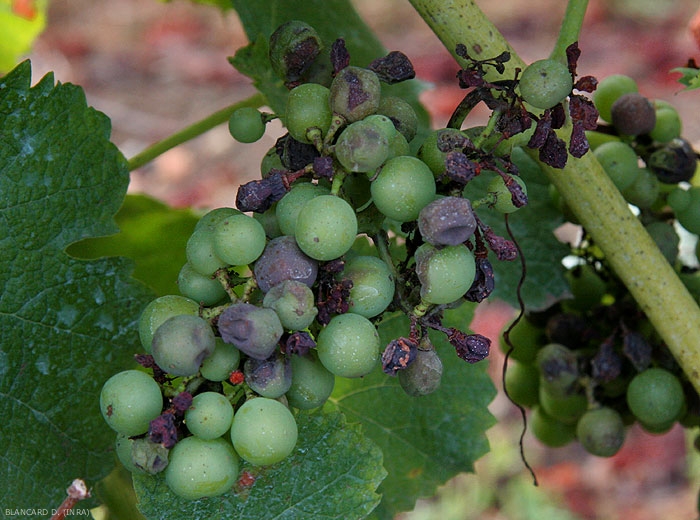 Le mildiou s'attaque, comme l'oïdium, aux baies de raison à l'état jeune, avant la véraison. Il les envahit et les fait pourrir, produisant un soit feutrage plus ou moins abandant (rot gris) (figure 3), soit conférant aux baies une teinte brunâtre (rot brun) (figure 4).