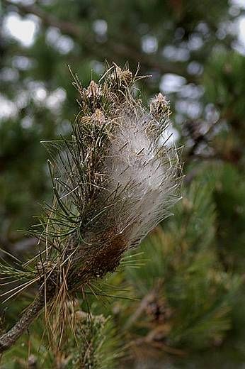 Les papillons émergent en juillet-août au coucher du soleil. Les femelles émettent des phéromones qui attirent les mâles. L'accouplement dure à peu près une heure. Les mâles meurent après l’accouplement et les femelles déposent leurs œufs en manchons brunâtres (2-3 cm) de 150 à 220 œufs en épis de maïs à la base des aiguilles ou autour de petits rameaux. Avant de mourir, la femelle camoufle sa ponte en déposant des écailles abdominales. La femelle peut voler sur plusieurs kilomètres ce qui favorise l’infestation des pinèdes.