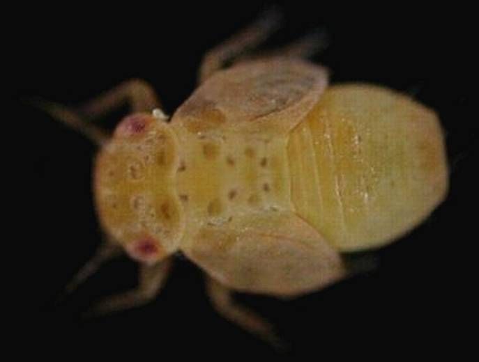 De couleur vert jaunâtre, les larves sont également caractérisées par leurs yeux rouges (figure 3). Les œufs ont jaune-orange, pondus le long des folioles et mesurent environ 0,3 mm.