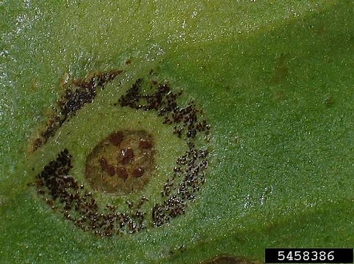 Les premiers symptômes se manifestent sous la forme de taches jaunâtres apparaissant sur le dessus des feuilles les plus anciennes. À leur emplacement, à la face inférieure du limbe, des pustules ou sores peuvent être observées ; elles sont de couleur rouille, organisées en anneaux concentriques simples ou doubles (figures 1 et 2).