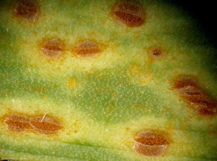 Une fois installé au printemps dans les tissus foliaires du poireau, le champignon produit des spores (des uredospores) de couleur orange clair à l'intérieur des pustules ou sores formés (figures 1 à 4). Celles-ci sont libérées et disséminées par le vent, voire les éclaboussures, les outils...