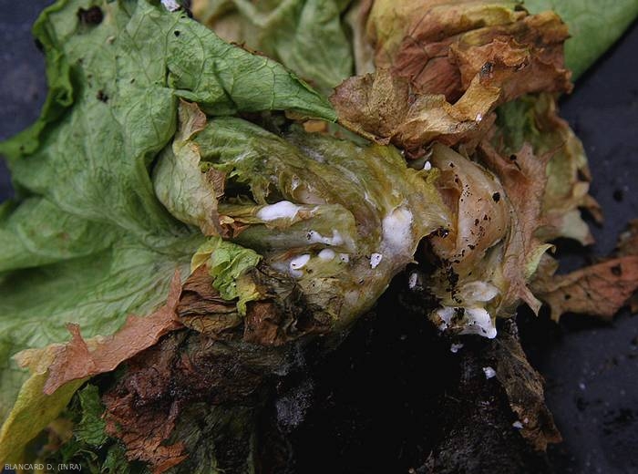 En fin de végétation, les plus extérieures puis l'ensemble des feuilles jaunissent et  flétrissent brutalement (figure 1). Par la suite, les plantes fondent littéralement sous les effets d'une pourritures humide (figure 2).