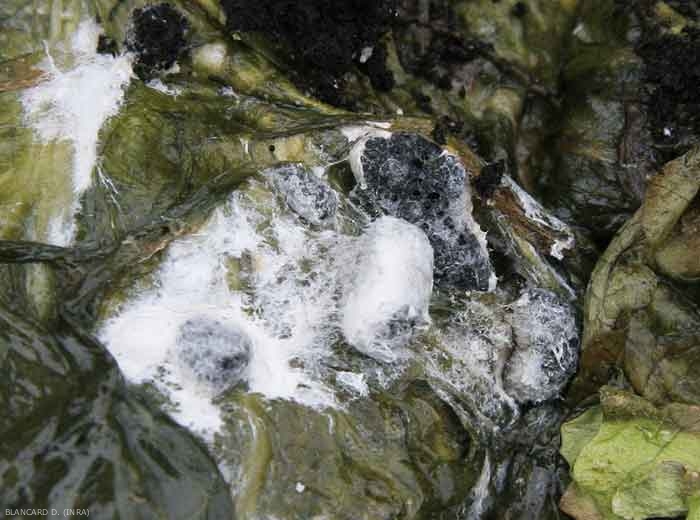 Sur la pourriture humide et molle, il n'est pas rare d'observer des filaments cotonneux blanc (mycélium du champignon) (figures 5 et 6), parsemée de masses noires plus ou moins grosses et irrégulières (sclérotes) (figures 7 et 8).
