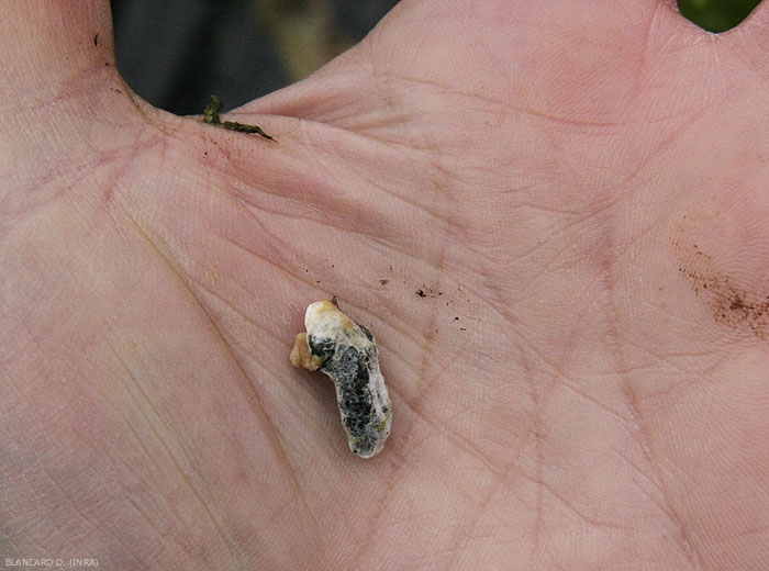 Sclerotinia minor forme des sclérotes en forme de petits grains noirs de 1 à 2 mm, dans un mycélium blanc assez peu abondant (figure 1). Sclerotinia sclerotiorum génère les mêmes symptômes, mais dans ce cas, le mycélium blanc est plus abondant et les sclérotes atteignent 3 à 4 mm de diamètre (figures 2 et 3).