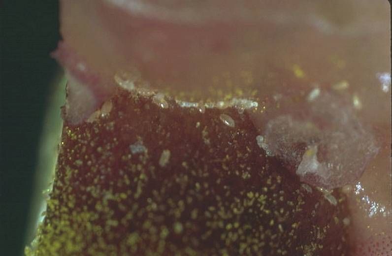 Le mâle est jaune alors que la femelle est brun clair brillant, avec une cuticule coriace. Les adultes mesurent entre 0,1 et 0,2 mm et ne sont visibles qu’à la loupe (figures 1 et 2). On les repère souvent grâce à leur déplacement assez rapide.