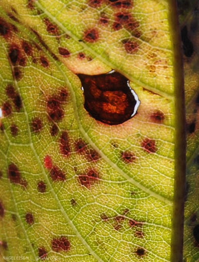 - Taches circulaires brun à pourpre (3 mm de diamètre), bordées par une auréole jaune, sur les limbes foliaires, qui évoluent en perforations entourées d'une marge violacée