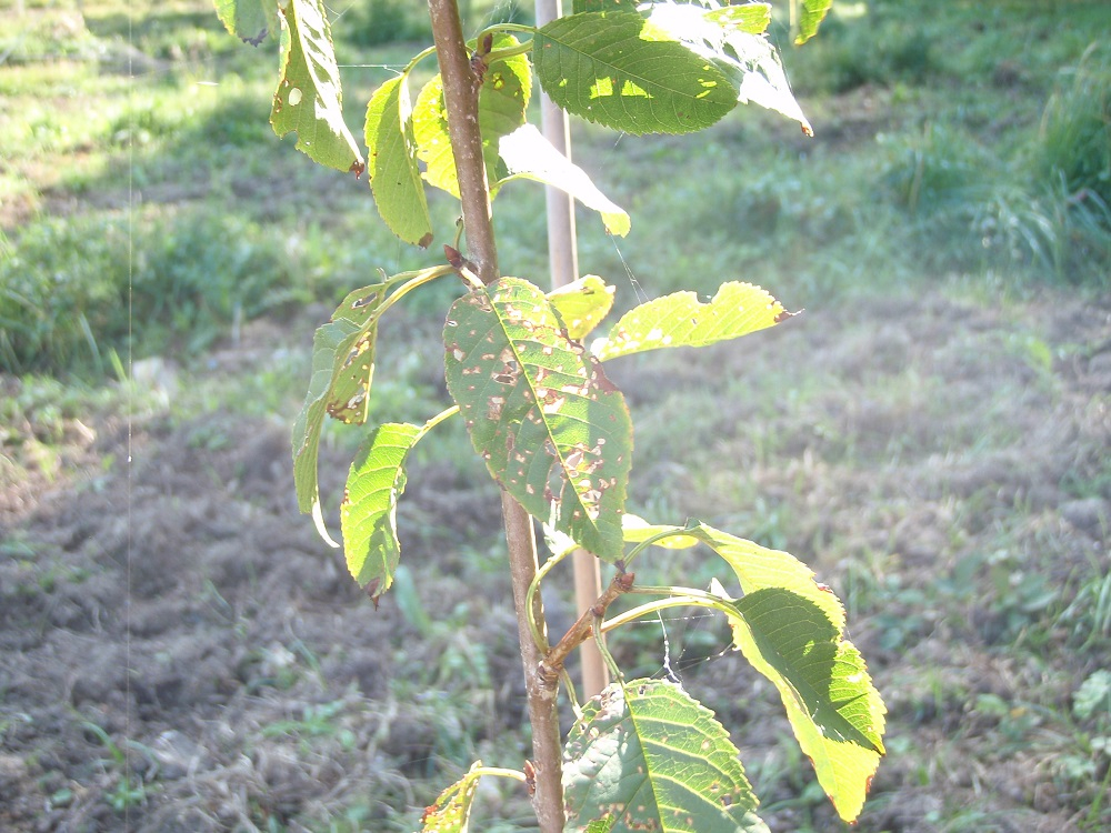En automne, les jeunes pousses fortement attaquées se couvrent de taches nécrotiques qui pourront évoluer ultérieurement en chancres actifs. Au printemps suivant, en effet, ces lésions chancreuses pourront provoquer des dessèchements de pousses et de grappes florales, en perturbant la circulation de la sève et en laissant exsuder une gomme abondante, au niveau des bourgeons.