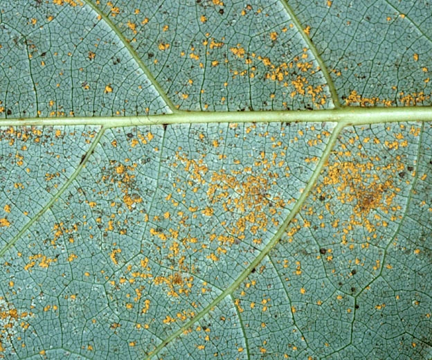 - Feuilles sur l'arbre : pustules jaunes orangées (face inférieure)