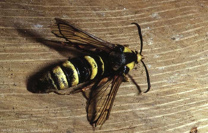 Adulte : papillon mimétique d'un hyménoptère vespidé avec l'abdomen jaune à rayures noires, aux ailes transparentes, de 45 mm d'envergure