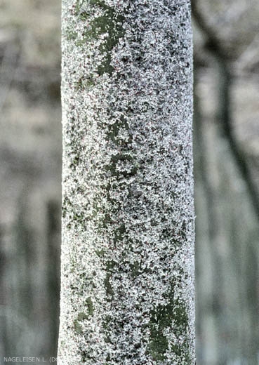 Feutrages floconneux recouvrant les écorces en plages discontinues, recouvrant des petites larves ovoïdes jaune orangé durant l'hiver.