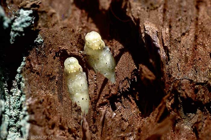 Durant l'hiver et le début du printemps, les oiseaux (pic, sittelle, ...) viennent chercher les prénymphes et nymphes dans leur logette et décollent des plaques de rhytidome pour prélever leur nourriture.