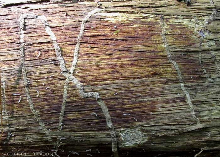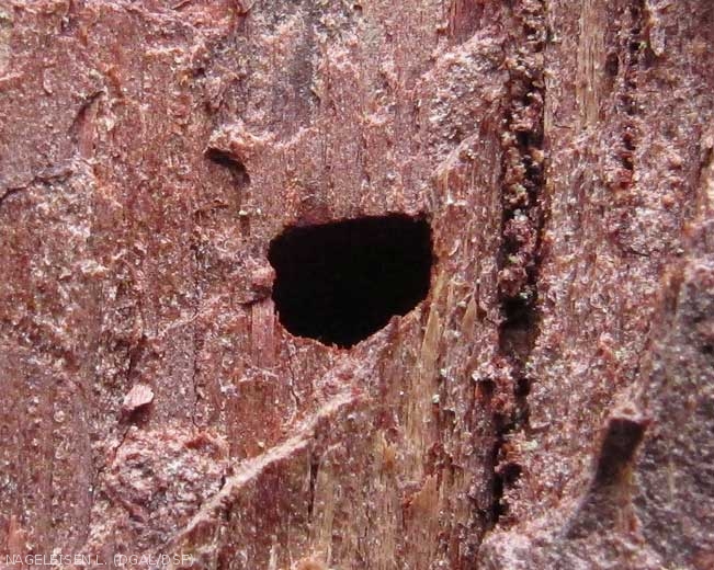 Au printemps, après essaimage, les adultes laissent un trou de sortie ovoïde caractéristique (en forme de D) bien visible à la surface de l’écorce. Enfin, en cas d'attaque massive, on observe des décollements d'écorce et des galeries sinueuses sous-corticales typiquement en zigzag. Sur un arbre peu attaqué, les suintements évoluent en un genre de chancre se cicatrisant en quelques années et laissant des traces internes dans le bois similaire au défaut du T.