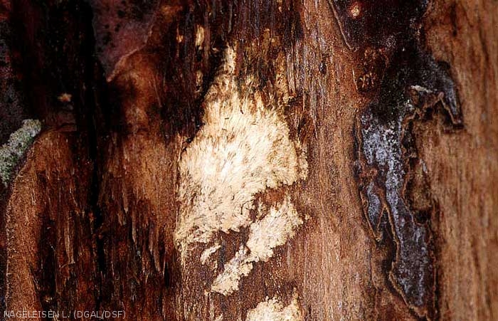 Les fructifications rouges ou orangées peuvent s’observer sur l’écorce. Arrivées à maturité et lorsque les conditions climatiques sont favorables (humidité élevée en particulier), les conidies sont disséminées en grande partie par la pluie ainsi que par le vent ou les insectes. Les ascospores sont éjectées à maturité et sont principalement disséminées par le vent. La germination des spores se produit à la faveur de blessures de l’écorce, naturelles (micro-fissures àl'insertion des branches) ou artificielles. Un mycélium jaunâtre caractéristique se développe entre le bois et l’écorce, formant souvent des palmettes enéventail.