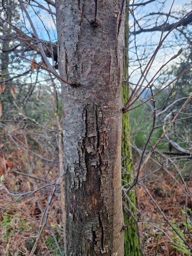 Le chancre peut se développer sur jeunes plants: les symptômes sont bien visibles (lésions oranges de l’écorce).