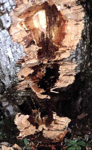 On observe sur le fût des suintements noirs plus manifestes en période de végétation. L’écorce est tourmentée avec présence de bourrelets cicatriciels qui aboutissent à un faciès chancreux partant toujours de la base de l’arbre.