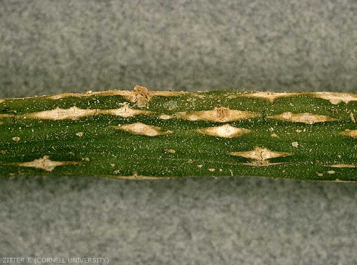 Monographella cucumerina produit des petites lésions blanches de forme allongée à losangique se développant sur le limbe et les nervures des feuilles (figures 1 à 3), les pétioles (figure 4), les rameaux, et les pédoncules (figure 5) des fruits.