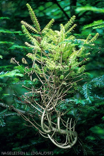 - Sur les sapins : la présence du mycélium issu de la germination des basidiospores entraîne le développement anormal d'un bourgeon et la formation d'une pousse verticale. Cette pousse se ramifie activement et donne naissance à un balai de sorcière, c'est à dire un ensemble de rameaux à aiguilles caduques, pauvres en chlorophylle et qui peut persister 15 à 20 ans.