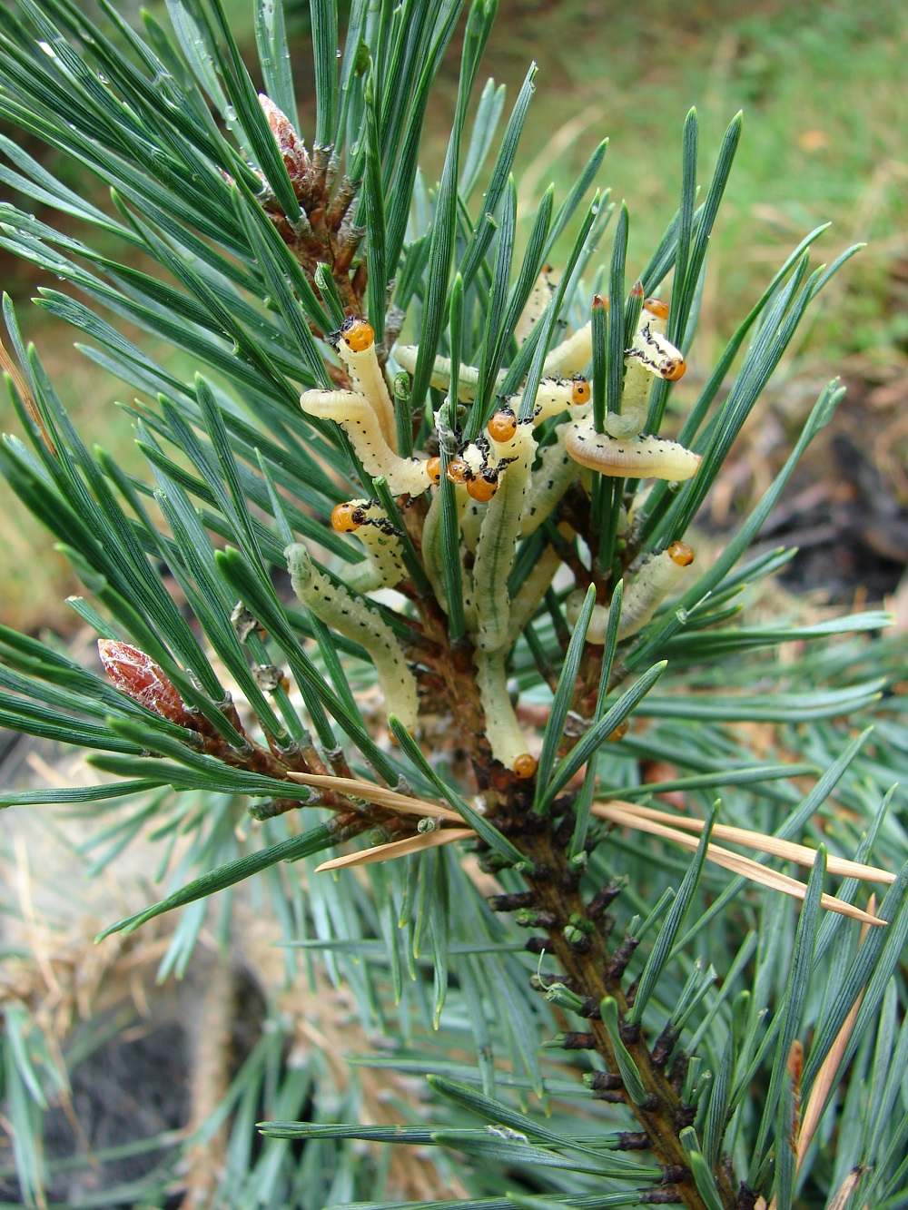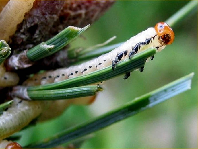 Les oeufs sont déposés en ligne par les femelles, dans des fentes pratiquées dans les aiguilles à l'aide de leur ovipositeur en dent de scie (d'où le nom de "mouche à scie", "saw fly" en anglais, qui leur est donné), et recouverts d'une substance brune. L'éclosion des fausses chenilles (larves) a lieu 3 à 4 semaines plus tard.