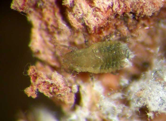 - Puceron de couleur vert-jaune ou vert sombre suivant les stades, dissimulé sous d’abondantes sécrétions cireuses blanchâtres