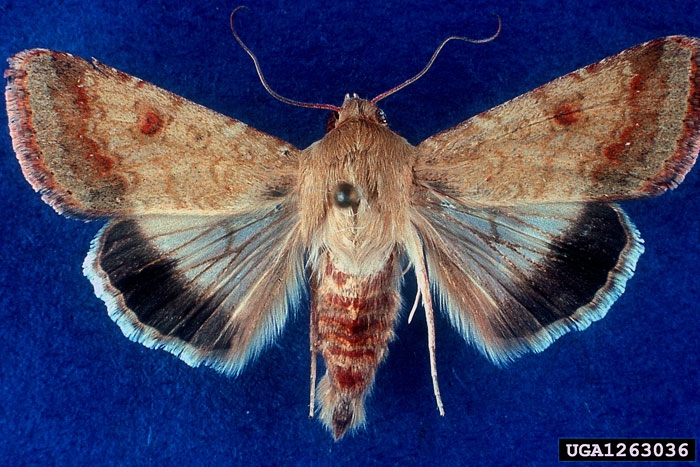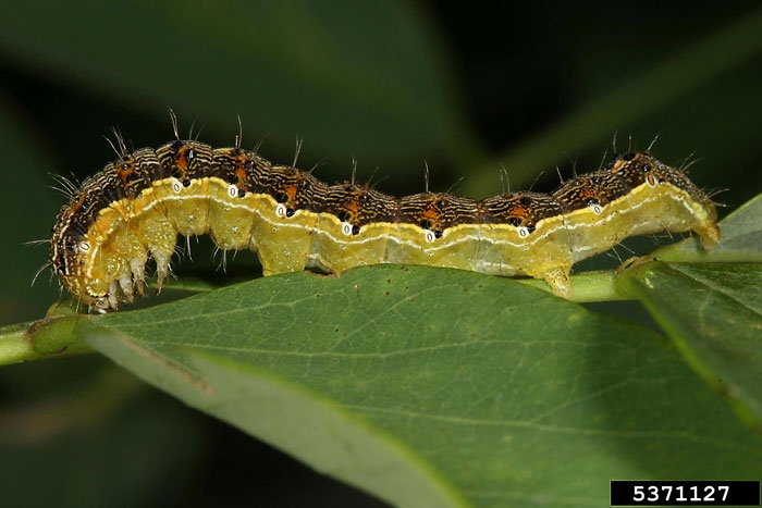 Les oeufs sont pondus sur les végétaux, de préférence à la face inférieure des feuilles, sur les jeunes pousses et sur les plantes en floraison. Ils mesurent moins d’1 mm de diamètre. Ils sont striés, blancs et virent au marron avant l’éclosion. L’incubation ne dure que 4 jours à une température de 25 °C. Une femelle peut pondre de 1500 à 4000 oeufs au cours de sa vie ce qui, comparativement à d’autres espèces est très élevé. Le risque de dégâts est donc important dès l’apparition de la première génération. Les chenilles (larves) ont un aspect changeant au fil de leur croissance (6 stades de développement sont distingués). Les jeunes larves, qui causent les dégâts, ont une couleur blanc-jaune à marron-rouge un peu tachetée, leur tête est marron moucheté. Les larves plus âgées sont ornées de bandes minces foncées et claires. Les larves sont souvent cachées à l’intérieur des organes végétaux qu’elles forent pour s’alimenter.