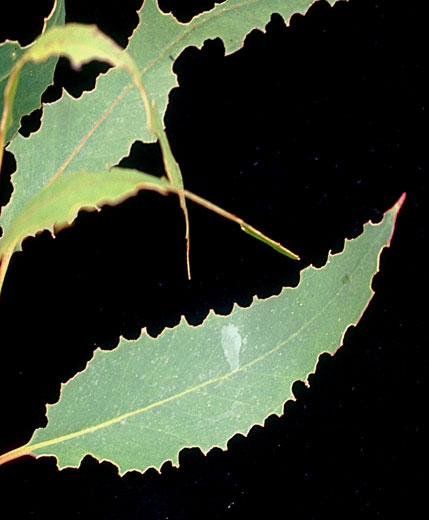 Les chenilles et les adultes se nourrissent des feuilles qui présentent alors des sillons décolorés à leur surface et des bords dentelés.