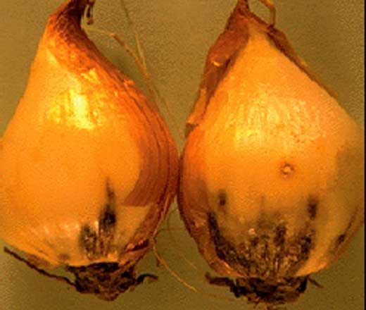 Les bulbes présentent d’abord des crevasses au niveau du plateau basal et développent du bas vers le haut des lésions gris-noires au sein des écailles les plus charnues. Les bulbes finissent par se dessécher.