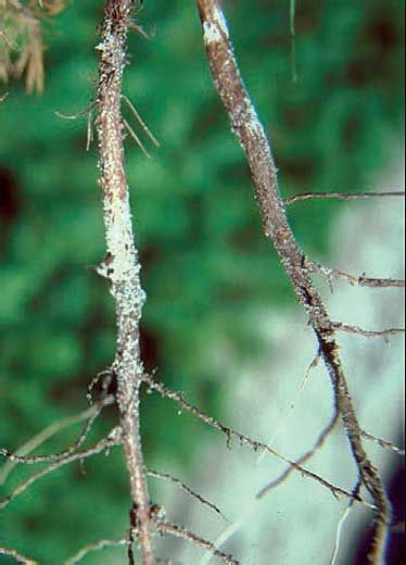 Concernant les plants plus âgés, leurs racines présentent des nécroses et un cortex qui a tendance à se désagréger. Juste au dessus du sol, le champignon provoque un étranglement de la tige principale. Si l’écorce est grattée, le bois est tout imprégné de résine et a pris une couleur marron. Le feuillage perd uniformément de sa couleur : les aiguilles prennent une couleur bleue, puis jaune pour enfin brunir et tomber. Les plus petits rameaux dépérissent ou présentent des chancres. Parfois, le collet est juste décoloré et les dégâts réellement causés ne sont constatés que lors de la manipulation des jeunes plants.