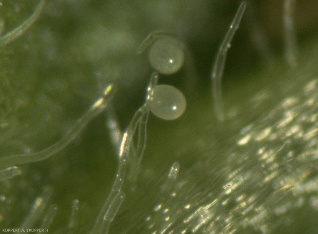 Les adultes (figure 2) mesurent 0.4mm, sont rose-beige, avec parfois un dessin orangé en forme de X. Ils ont des pattes courtes et de nombreuses petites soies.