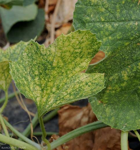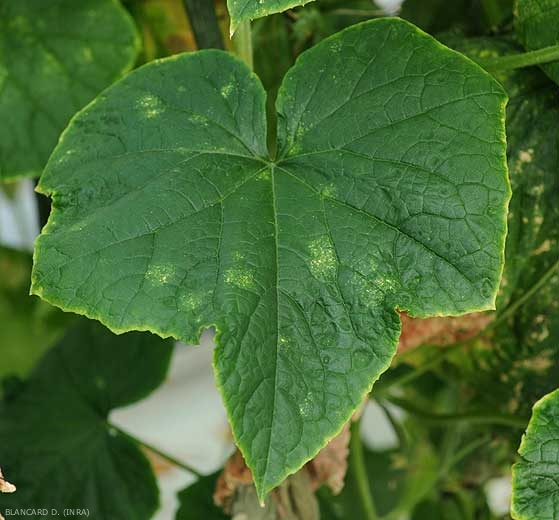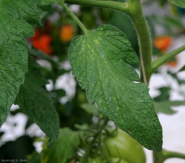 - Destruction ou disparition de la chlorophylle : engendre la réduction de la photosynthèse et de la croissance des plantes. En cultures de tomates et de concombres, les pertes de rendement sont considérables lorsque 30 % de la surface foliaire sont endommagés.