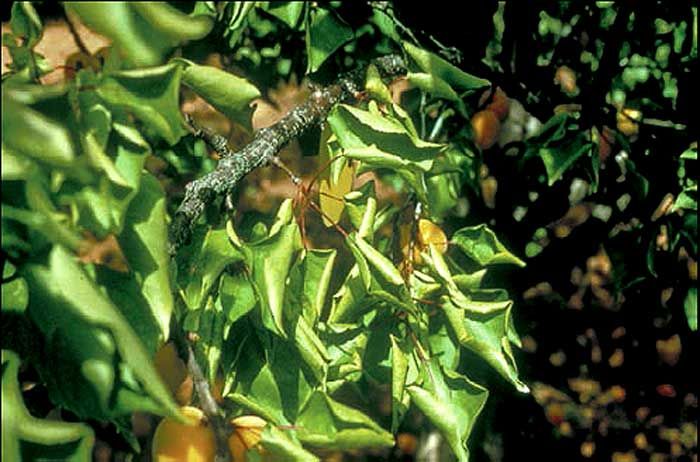 - Au cours de l’été, les feuilles s’enroulent, souvent de manière polygonale. Elles présentent des taches chlorotiques.