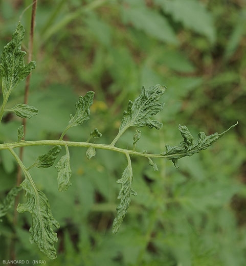 - infestation légère : petites taches brunes ou un fin réseau des rainures brunes sur le mésophylle vert de la feuille. De petites formations subéreuses marron peuvent apparaître sur le pétiole et les nervures principales. L’apex des plantes infestées prend une apparence difforme, avec des feuilles enroulées et des décolorations locales marron causées par des formations subéreuses (figures 1, 2 et 3).Les fleurs sont fréquemment décolorées.