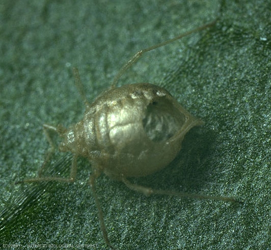 Les pucerons parasités ne meurent pas immédiatement et continuent généralement à se nourrir et à sécréter du miellat (figure 2). Ils sont également toujours capables de transmettre des virus et de donner naissance à de jeunes pucerons pendant encore deux jours. Cependant, un puceron parasité à un stade jeune ne pourra pas se reproduire.