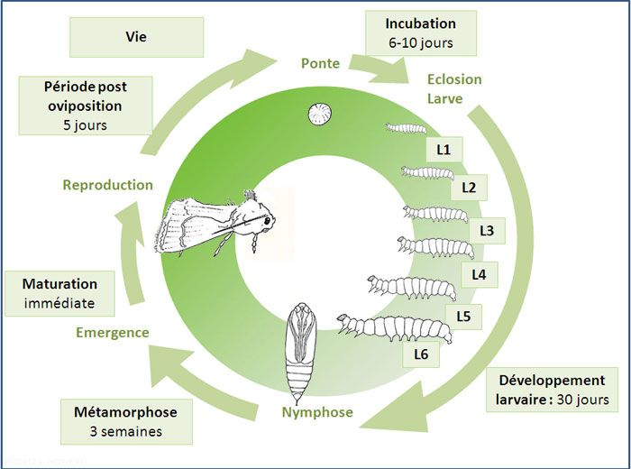 Sous serre, on observe davantage de générations, qui se chevauchent. La diapause hivernale a lieu en général au stade nymphe dans le sol, mais les chenilles entrent également souvent en diapause.