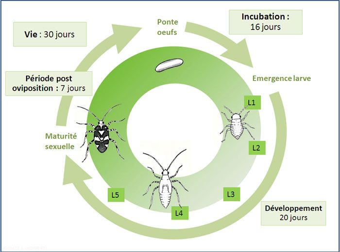 En climat tempéré, les premiers œufs sont pondus en juin ou juillet sur les plantes hôtes d’été, les premières punaises sont observées dès la mi-Mai dans les serres.