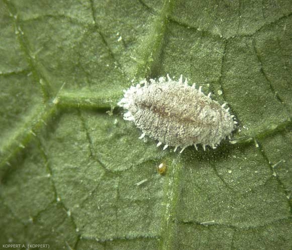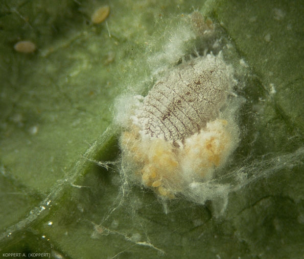 Oeufs : pondus dans une espèce de sac allongé cotonneux, composé de filaments blancs cireux produit par la femelle et qui est situé dessous et derrière son corps (figure 2). Les œufs eux-mêmes sont jaune clair, ovales à ronds, et séparés les uns des autres par une couche de cire.