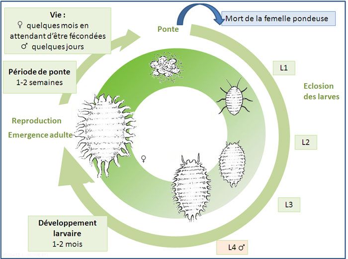 Ci-dessus le cycle de développement de Planococcus affinis.