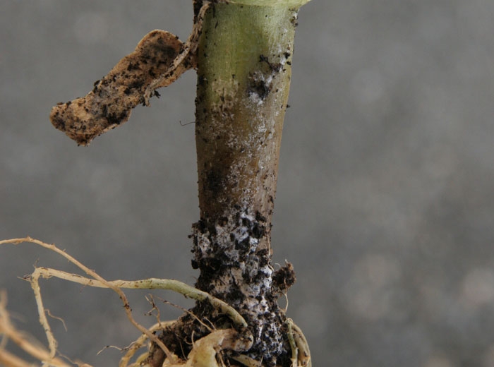 La portion de tige près de la surface du sol est couverte par un mycélium de couleur blanche à rosâtre (figure 4) sur lequel se forment les sporodochies et les macroconidies de ce Fusarium.