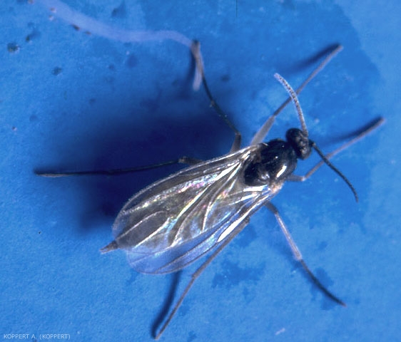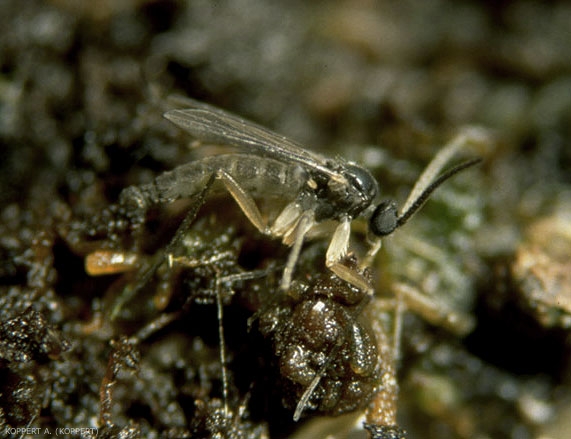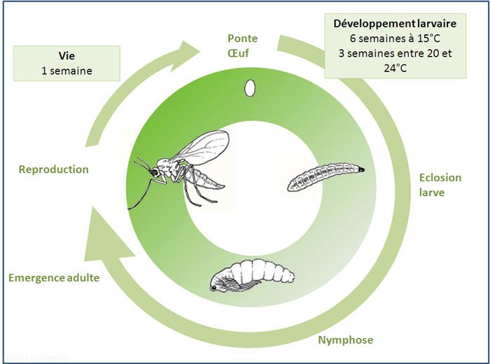La femelle s'accouple quelques heures après son émergence Les oeufs sont pondus à la surface du sol, près des racines des plantes. Les femelles sont attirées par les endroits humides avec beaucoup de matière organique.