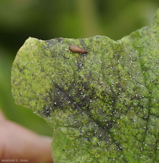 De nombreux insectes, notamment les pucerons, les aleurodes et les cochenilles, doivent prélever de grandes quantités de sève afin de satisfaire leurs besoins en protéines. Cela les oblige à rejeter le sucre en excès, en grandes quantités, sous la forme de miellat. Celui-ci souille alors la surface des parties du limbe colonisées par ces insectes. Ce miellat sucré est une véritable aubaine pour plusieurs champignons du phylloplan des plantes qui l'utilisent pour se nourrir, et qui sont à l'origine de la fumagine. En effet, leur développement conduit à l'apparition progressive d'une à plusieurs moisissures sur le limbe, la tige et même les fruits ; elles présentent des teintes variables en fonction des espèces fongiques (Alternaria spp., Cladosporium spp., Capnodium sp., Penicillium sp., etc.).