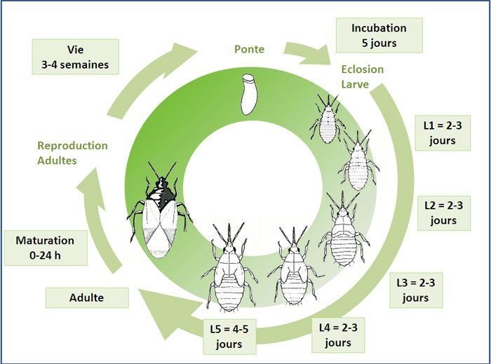 Le cycle biologique d'Orius niger compte 7 stades de développement : l'oeuf, 5 stades larvaires et le stade adulte (figure 2).
