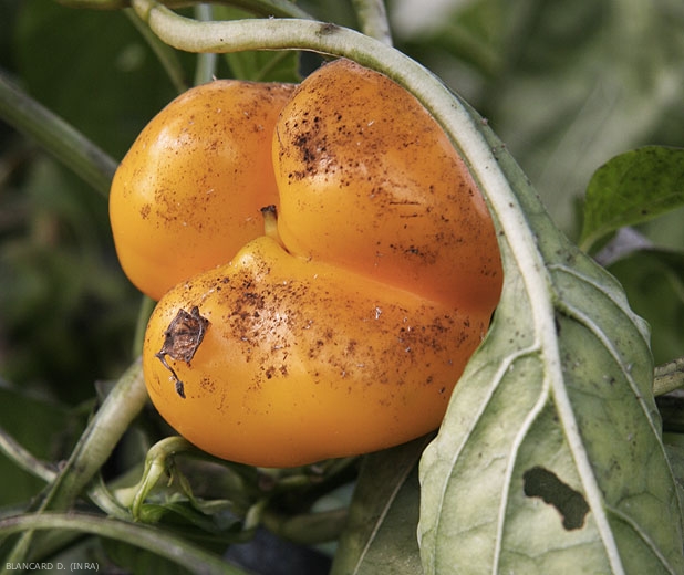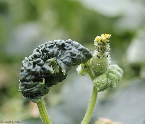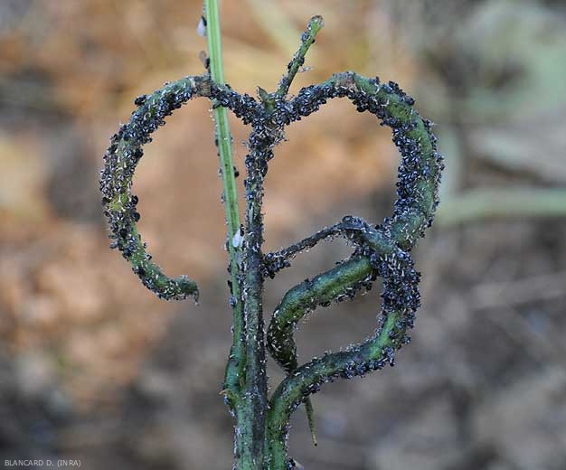 - présence de miellat à la surface des organes aériens, sur lequel se développe la Fumagine* (sooty mold). Rappelons que cette dernière peut avoir plusieurs conséquences, notamment une réduction de la photosynthèse et de la respiration foliaire et la souillure de fruits rendus ainsi non commercialisables.