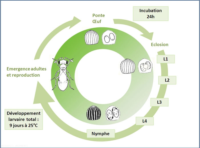 Ci-dessus le cycle de développement de Trichogramma spp.