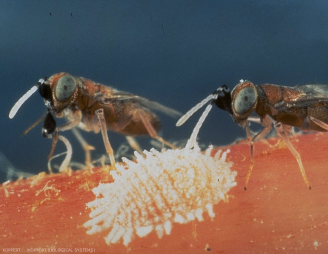 Avant d'y déposer son oeuf, la femelle parasitoïde inspecte l'hôte durant quelques secondes, puis elle insère son ovipositeur entre les filaments cireux (figure 1). En général, elle ne pond qu'un oeuf par hôte. S'il lui arrive d'en pondre d'avantage, un seul se développera.