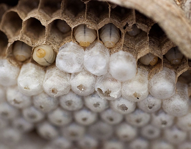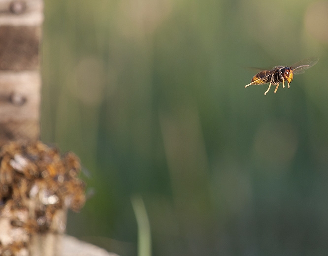 Au début le nid n’est pas plus gros qu’une balle de golf. La reine pond ses premiers œufs dont émergent les toutes premières ouvrières de la colonie fin mai début juin. Celles-ci s’occupent, par la suite, de la plupart des tâches : nourrissage des larves (figure 2) ; construction, agrandissement, entretien et défense du nid. La reine reste au nid pour pondre. La colonie augmente en taille assez rapidement ; ses besoins augmentent de concert, notamment pour les protéines qui servent à nourrir les larves. De ce fait, la prédation sur les ruchers augmente de façon importante entre juillet et octobre (figure 3), jusqu’à ce que les sexuées (mâles - figure 4 - et futures reines) émergent. Ceux-ci quittent la colonie pour se reproduire, puis les mâles meurent, ainsi que les ouvrières et la reine à l’origine de la colonie. Les futures reines (fécondées ou non) passent l’hiver à l’abri dans des troncs d’arbre par exemple et sortent au printemps suivant pour fonder leur propre colonie.