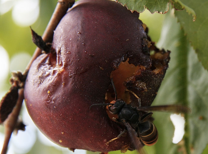 Enfin, notons que le frelon asiatique occasionne aussi des dégats sur les végétaux ; il les consomme parfois et notamment des fruits comme par exemples des baies de raison (figure 8), des pêches (figure 9)...