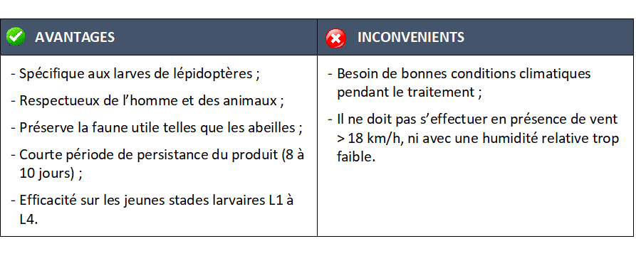 L’emploi de ce bioinsecticide s’effectue généralement sur de grandes surfaces à partir du sol, à l’aide de canons atomiseurs, principalement durant les mois de septembre à décembre lorsque les chenilles se trouvent aux stades L1 à L4. Cette période d’application encadrée permet d’optimiser la sélectivité de la bactérie, étant donné que peu d’espèces d’autres lépidoptères se trouvent en phase larvaire durant l’automne.